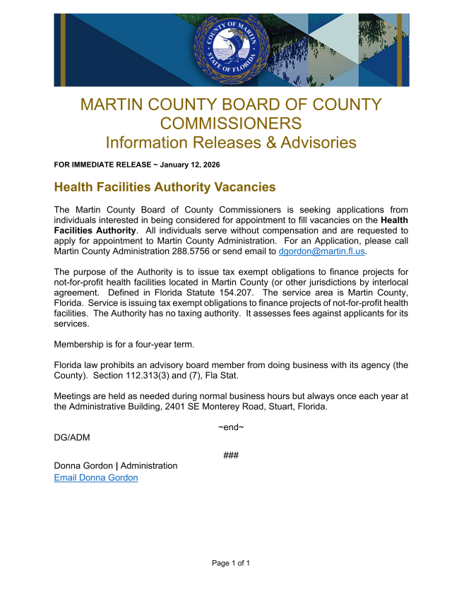 Martin County BOCC Announces Health Facilities Authority Vacancy