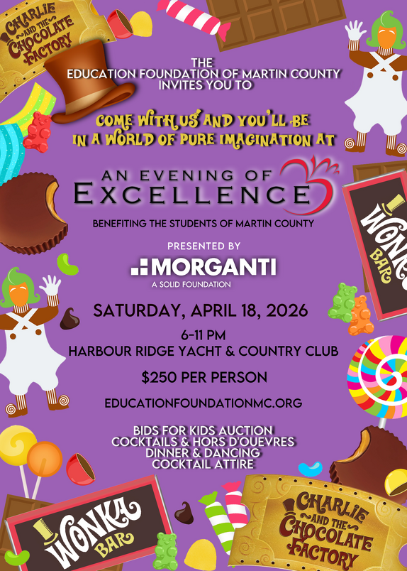 Step into a World of Pure Imagination and join the Education Foundation of Martin County for our most anticipated event of the year, An Evening of Excellence | Bids for Kids, on Saturday, April 18, 2026, at Harbour Ridge Yacht & Country Club.