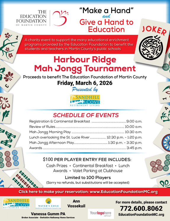 Mark your calendars and get ready for a fun-filled day of tiles, strategy, and philanthropy! The Education Foundation of Martin County’s Charity Mah Jongg Tournament returns on March 6, 2026, at the beautiful Harbour Ridge Yacht & Country Club.